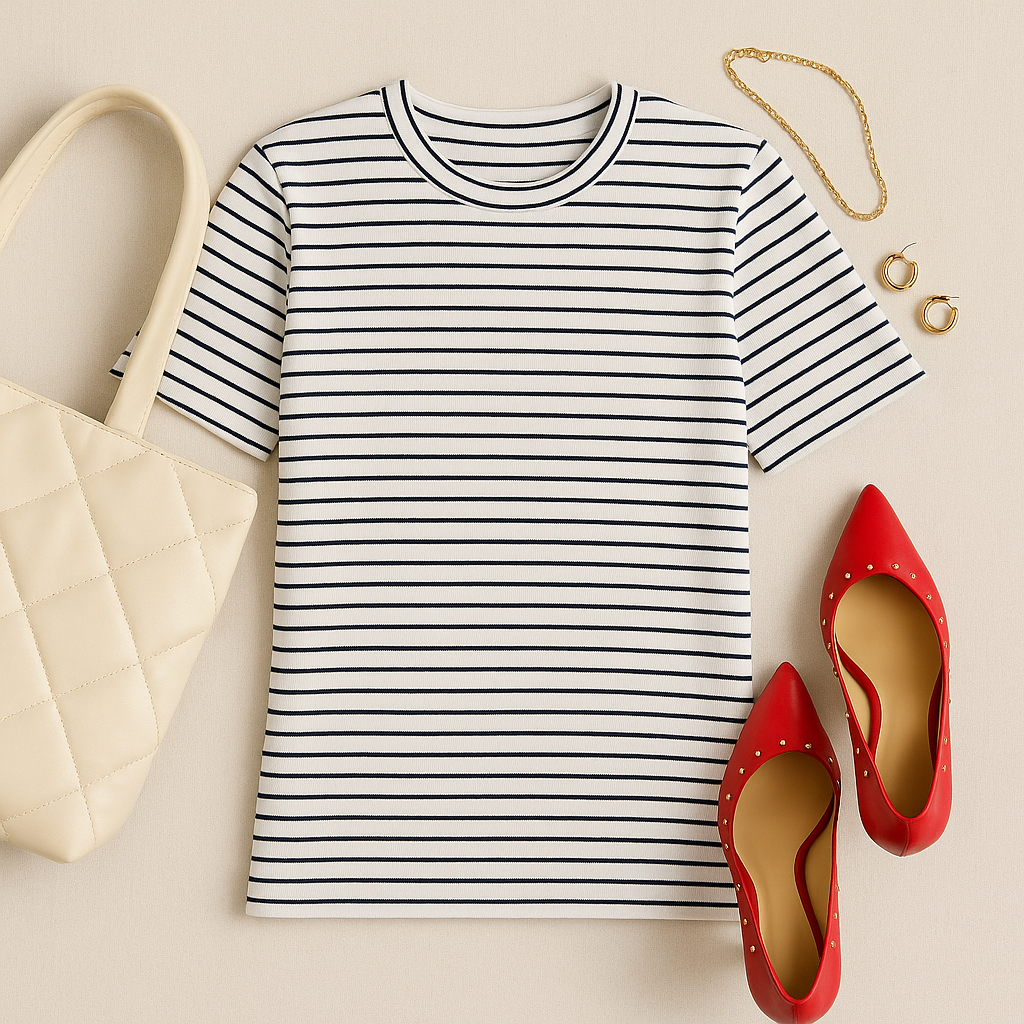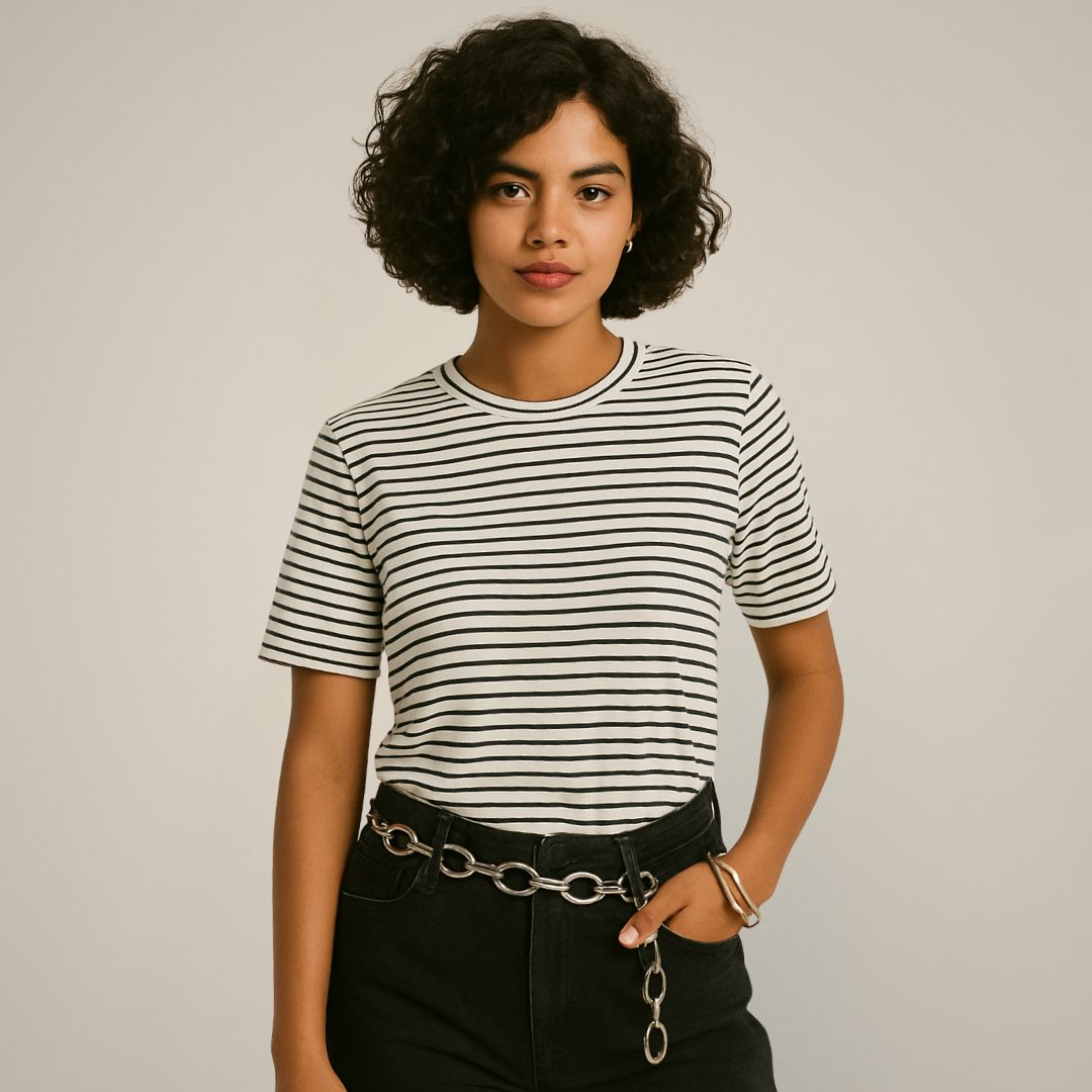 Estilo elegante e moderno: Use com uma calça de alfaiataria preta, loafers e um blazer off-white para contrastar com as listras. Um relógio metálico e um coque polido completam um visual atemporal e refinado, ideal para reuniões ou eventos mais formais.